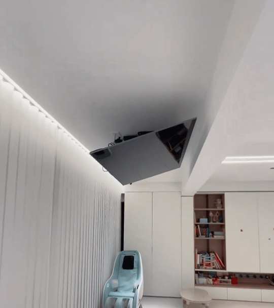 淌若干扰的双方,都有看电视的需求,还可以探讨这种可旋转的悬浮电视墙,旋转形势,有手动的,也有电动的!