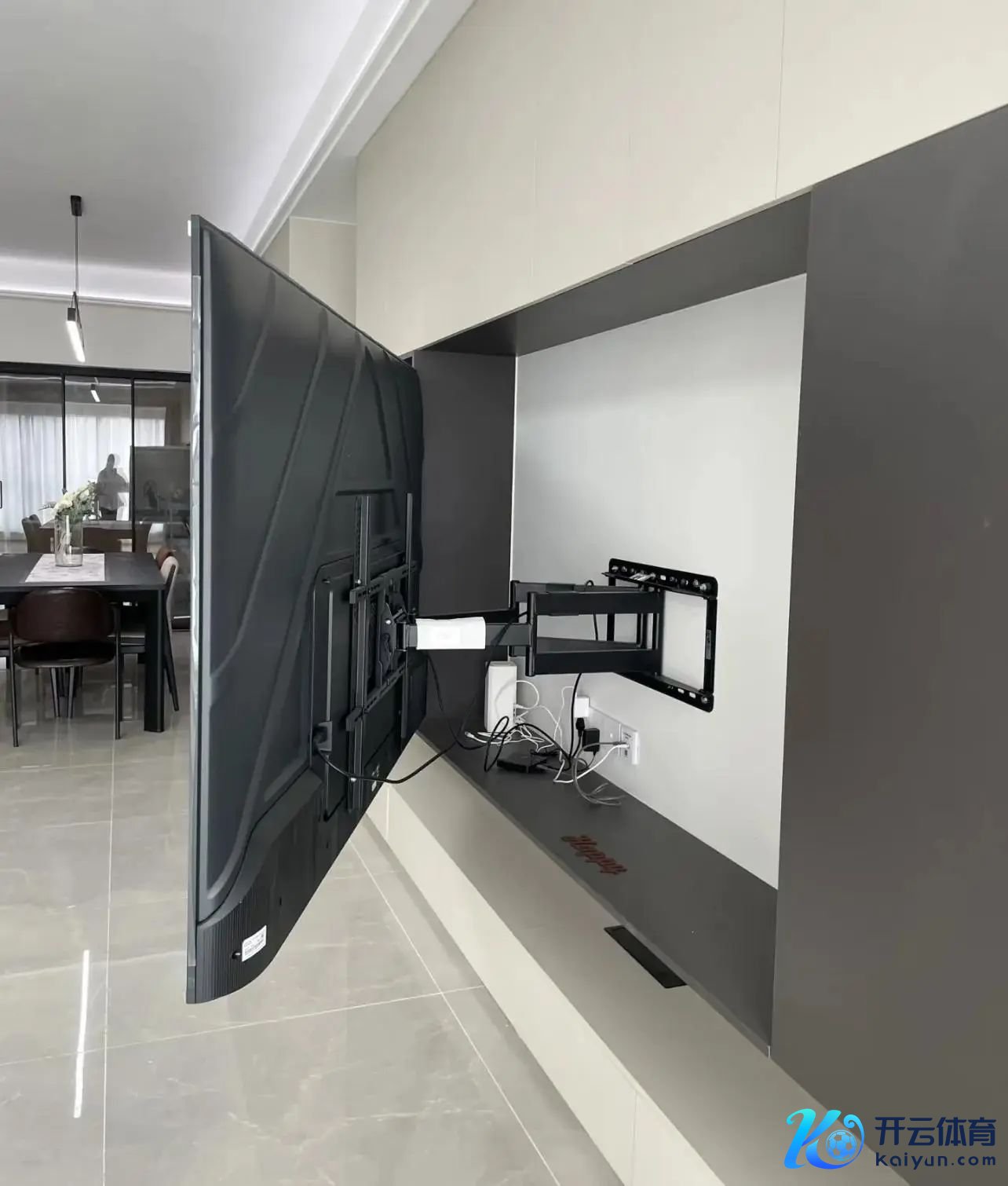 传统的电视挂法,想要在餐厅看电视就难了。