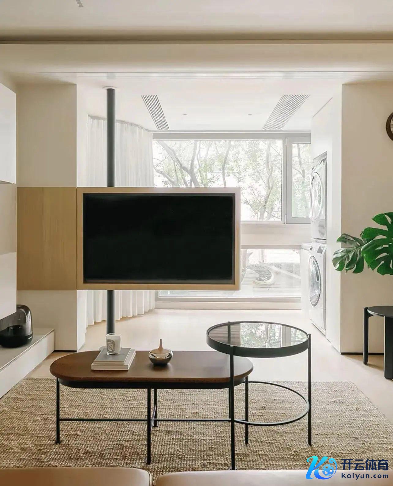 看电视时,电视旋转对着客厅,不看电视时,电视旋转一下,也不影响去阳台的动线。