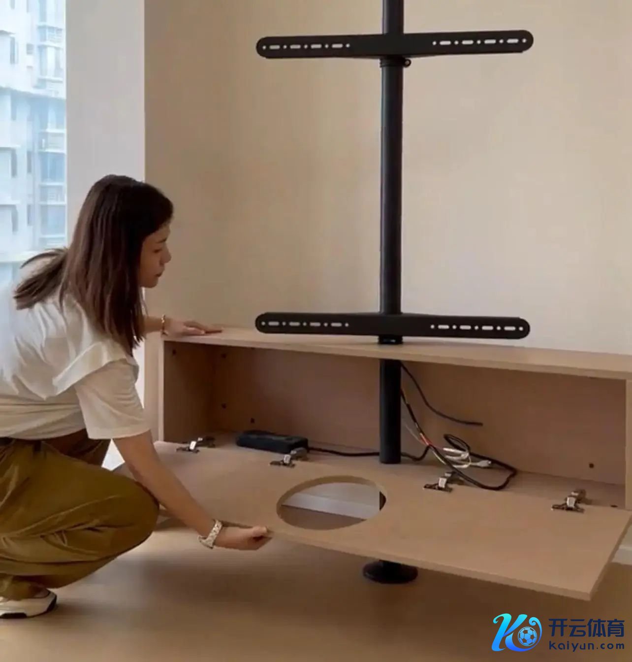 等于是把上头悬浮墙里的电动旋转支架拿出来了,加长了,顺利撑在了家里的地和顶之间。